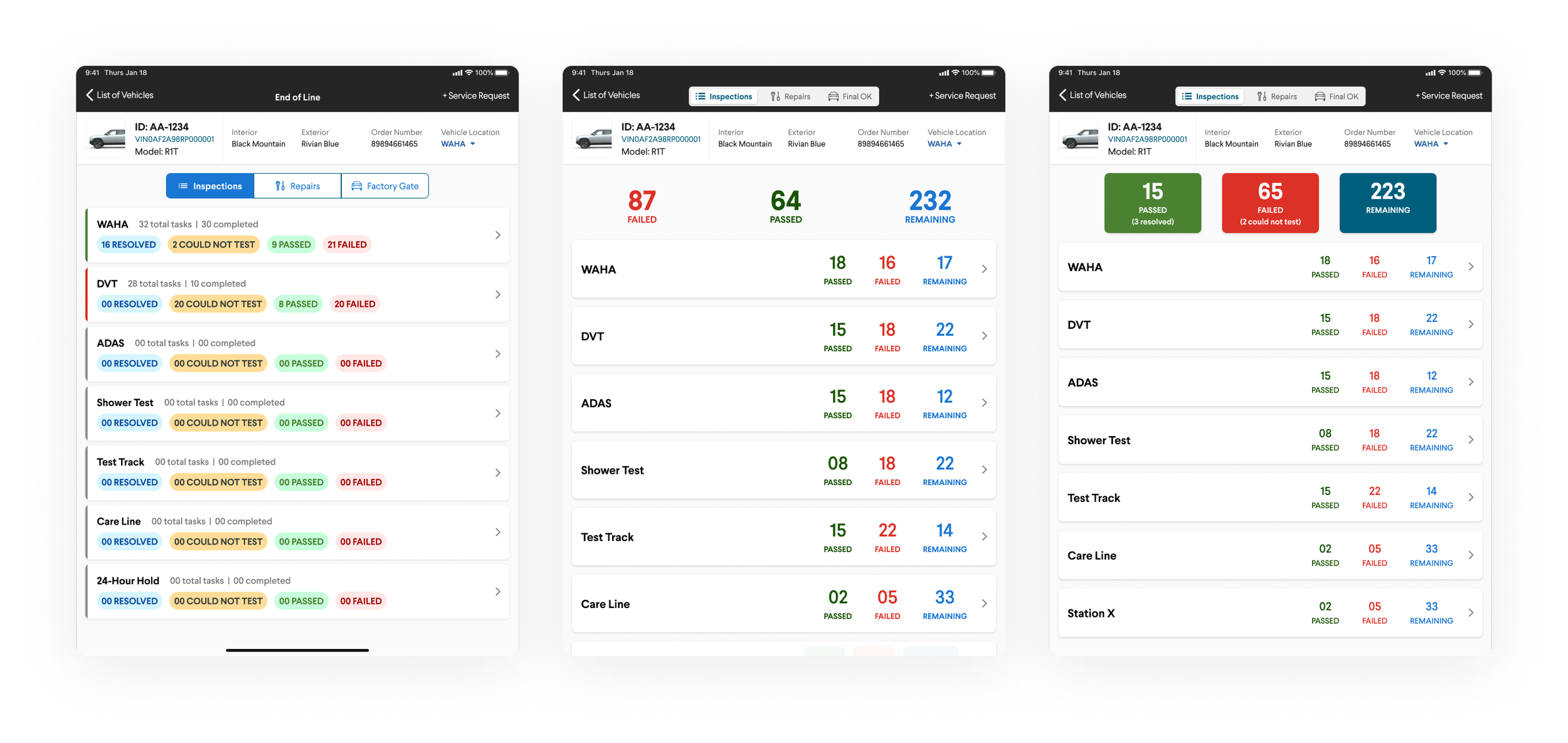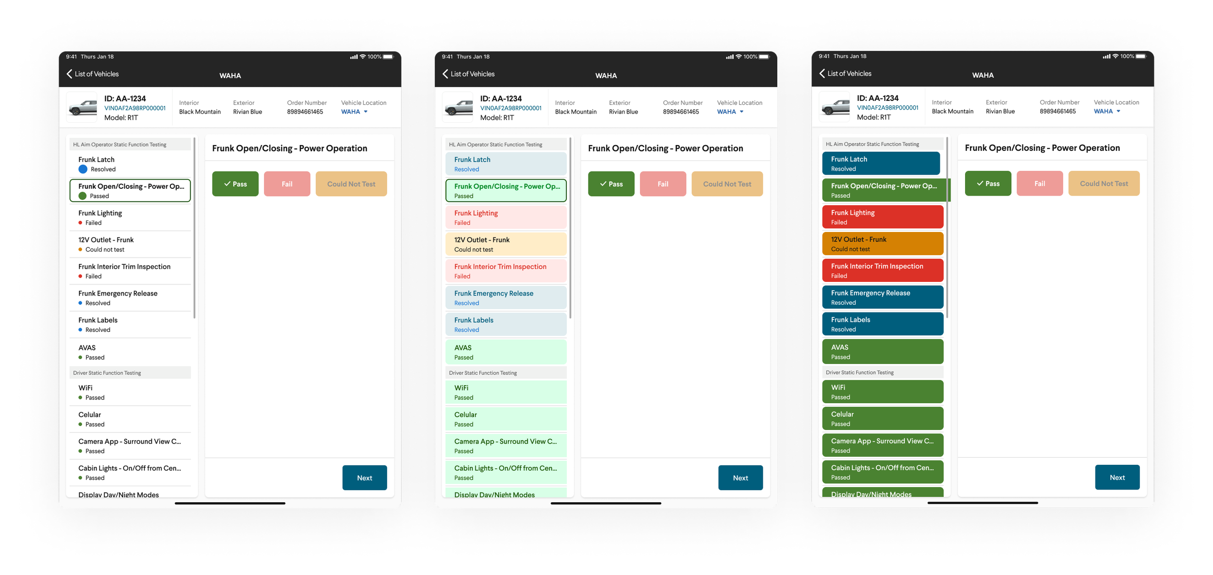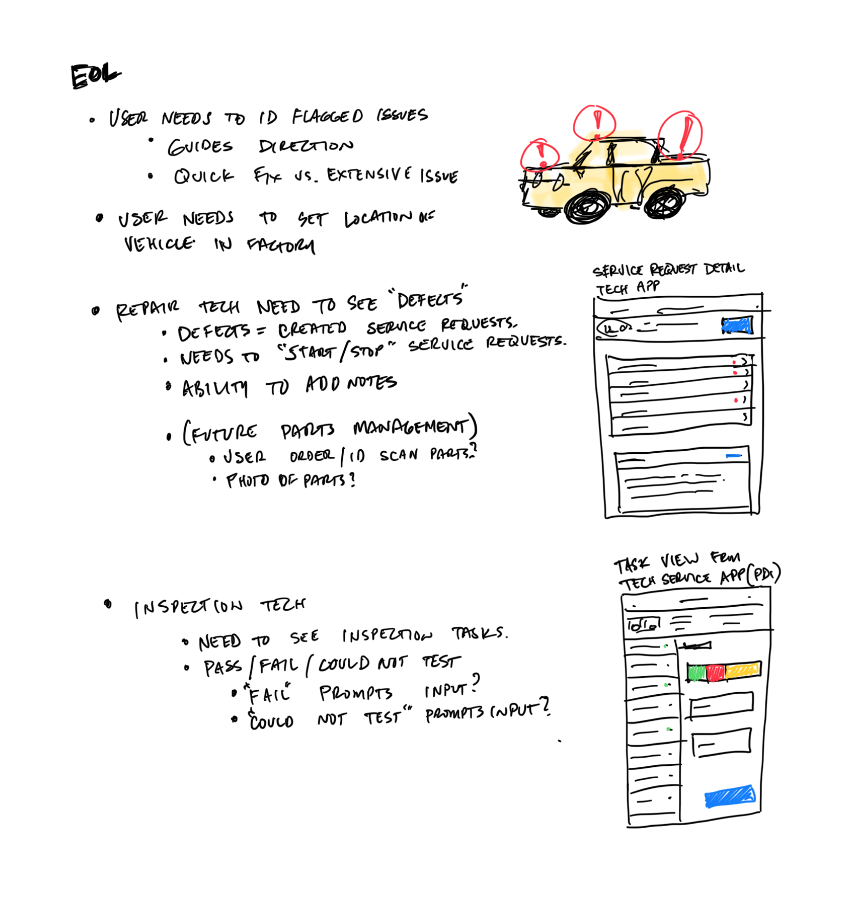 At Rivian, I led the design of the factory application allowing technicians and leads to complete tasks needed at the final steps of production such as final checks and calibrations. Vehicle management after the production line was poor causing low factory output. The pressure was high - We were pre-IPO and customers had been waiting for ~3 years for their vehicle after pre-ordering. Additionally, valuable data reflecting production issues and patterns, were not being captured effectively. This delayed the learning and adapting in real time of factory processes and pattern failures.